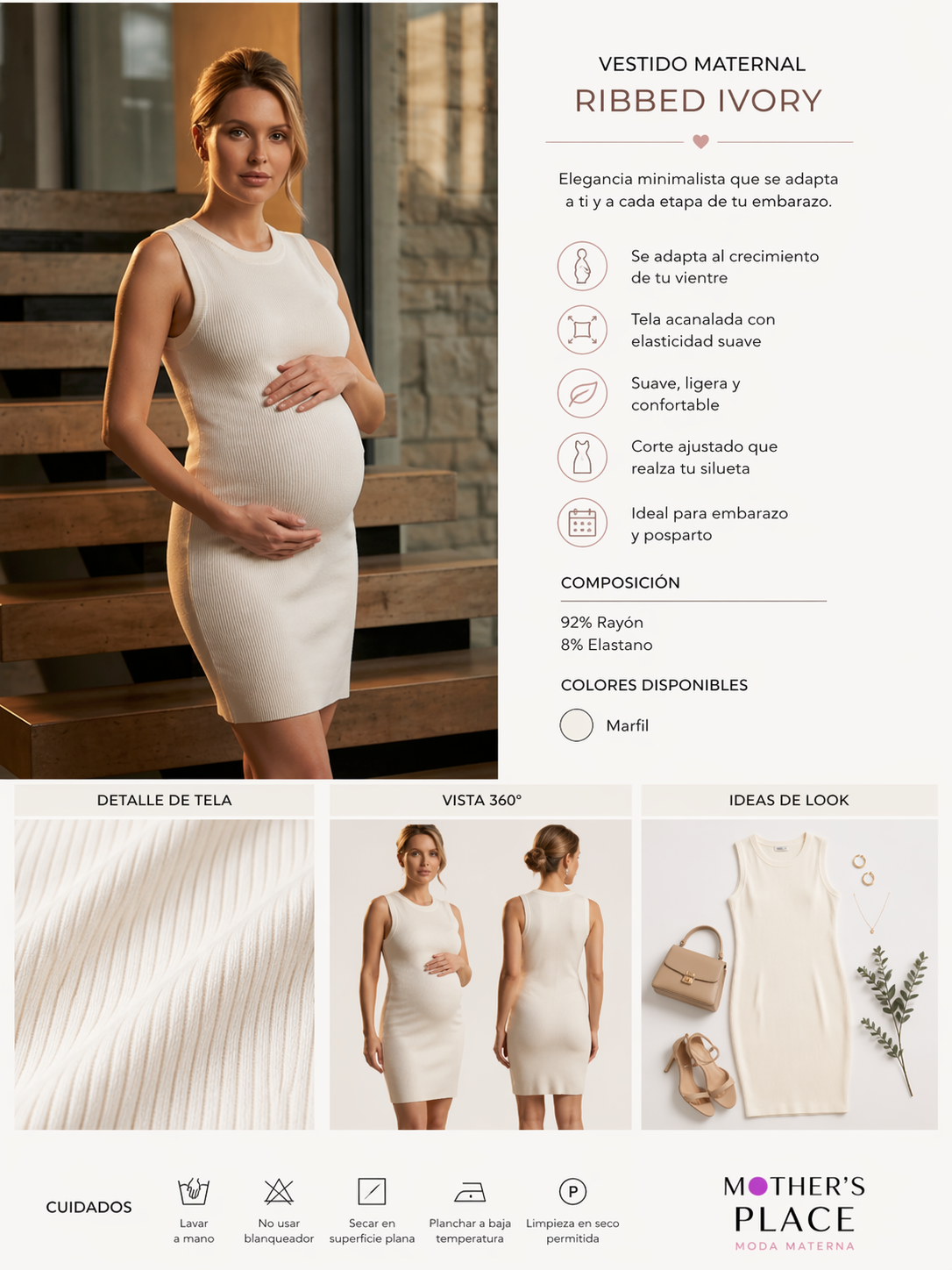 Ideal para looks modernos y versátiles, este vestido es perfecto para ocasiones especiales, salidas casuales o sesiones de maternidad. Su acabado minimalista y tono marfil lo convierten en una pieza timeless que puedes combinar fácilmente con sandalias, flats o tacones.